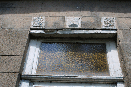 Rechthoekige vensters met arduinen lekdrempels en houten rolluikkasten; strekse ontlastingsboog. Licht getoogde deur met geprofileerde arduinen omlijsting op neuten. Eenvoudig hoofdgestel met gelede houten architraaf en rechte kroonlijst.