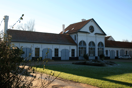 Gekasseide erekoer vooraan het kasteel (oost-zijde) met ten zuiden ervan de voormalige boerderij (thans woonhuis) en ten noorden de z.g. "oranjerie". Dit woonhuis heeft een kern van drie traveeën en één bouwlaag met boven de hoofdgevels een driehoekig fronton waarin een oculus met uurwerkplaat. Bepleisterde en beschilderde lijstgevel met rondbogige deurvensters met waaier in elke travee. Aan beide zijden een lagere aanbouw waarin korfbogige koetspoorten afwisselen met rechthoekige vensters.