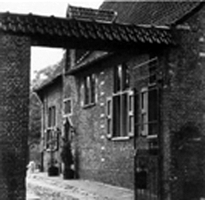 van de afbeelding. Het is tot de buitenzijde van de gevel doorstekende kopeinde van de eiken moerbalken. Dit kopshout, meer dan drie eeuwen aan regen en wind blootgesteld, was tot een diepte van ongeveer 5cm "uitgemergeld", en daarachter gezond en beenhard. Voordeur voor en na de restauratie. |